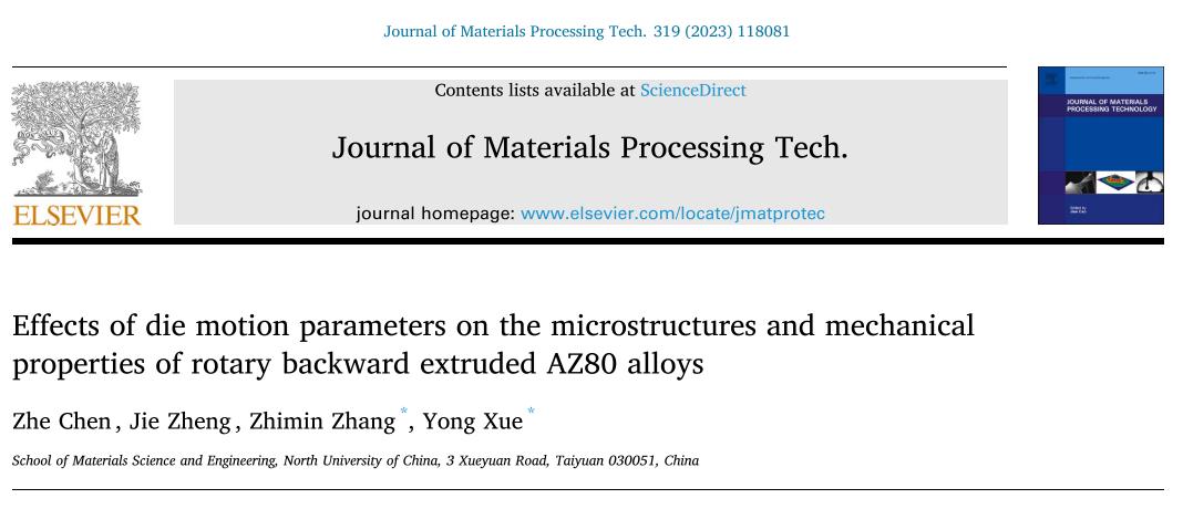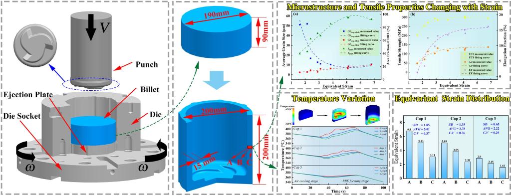 近日,我校leyu.com张治民教授团队,针对航空航天和国防军工装备用轻合金舱体各向异性大的痛点,提出了旋转挤压成形新技术,有限元模拟结合物理实验,精确设计与控制成形件的温度场及应变场,在自主研发的国内外首台多向加载旋转挤压机上,加工出弱各向异性镁合金舱体。成果报道于制造领域顶刊《Journal of Materials Processing Technology》(链接:https://doi.org/10.1016/j.jmatprotec.2023.118081)。我校leyu.com博士生陈喆为第一作者。