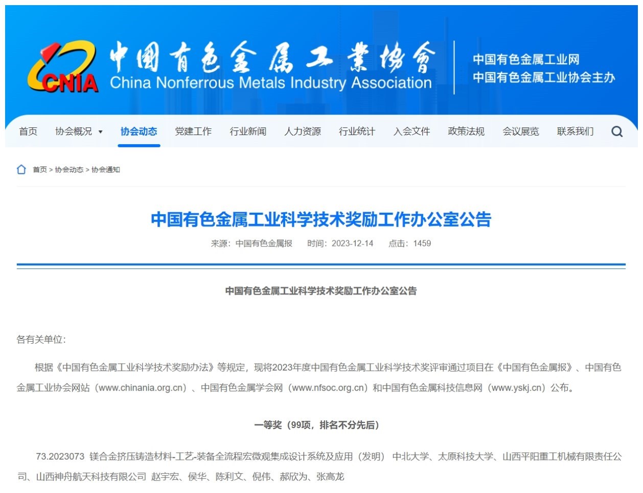 12月16日,中国有色金属工业协会公布了2023年度“中国有色金属工业科学技术奖”获奖信息,我院赵宇宏教授团队牵头,由太原科技大学、山西平阳重工机械有限责任公司、山西神舟航天科技有限公司共同参与的“镁合金挤压铸造材料-工艺-构件全流程宏微观集成设计系统及应用”项目,获评中国有色金属工业技术发明一等奖。