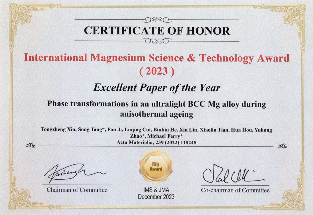 同期,项目相关成果“材料设计和工艺优化宏微观统一相场EasyPhase/Cast智能控制系统”受邀参加第三届亚洲创新发明展览会(香港展),获得金奖;发表在国际金属顶级期刊Acta Materialia的报道“Phase transformations in an ultralight BCC Mg alloy during anisothermal ageing”获得国际镁协2023年度最佳论文奖。