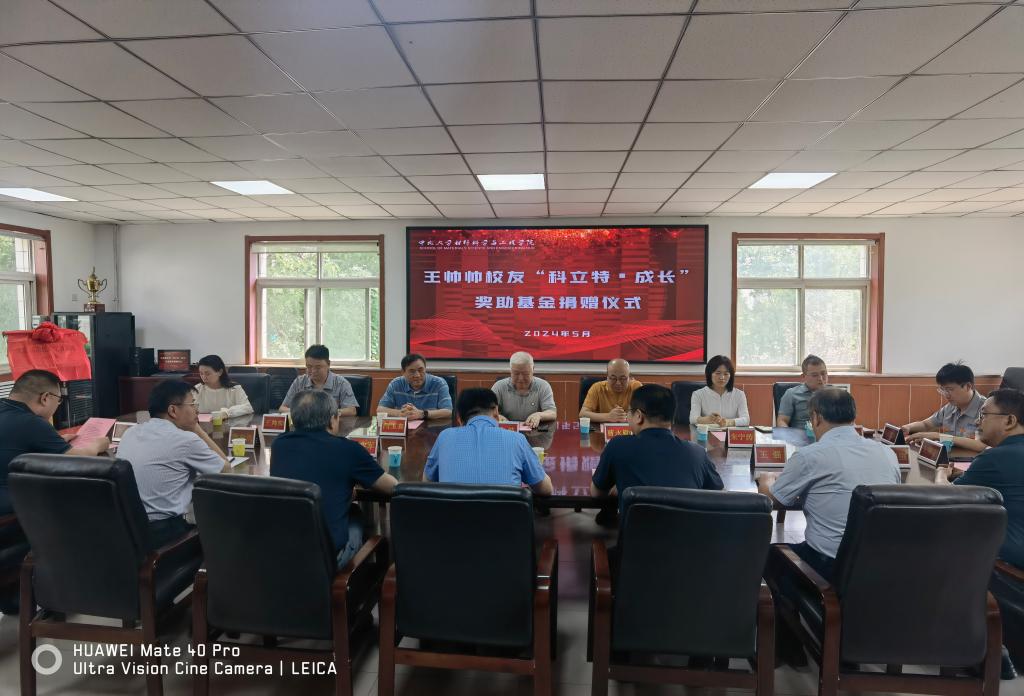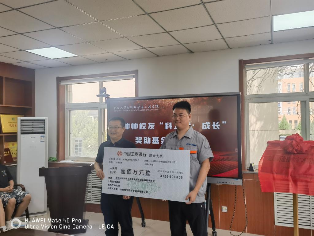 中北大学建校83周年校庆之际,乐鱼官网2006届校友、山西科立特精密铸造有限公司董事长王帅帅于5月20日为母校献礼,设立100万元的“科立特·成长”奖助基金。捐助仪式在leyu.com会议室举办。出席捐赠仪式的嘉宾有山西校友会会长杨波、山西校友会副会长兼秘书长曹永勤、山西校友会副会长兼晋城分会会长闫玉喜、山西校友会副秘书长兼晋城分会秘书长朱宁涛、山西校友会副秘书长高雨荷、山西校友会晋城分会副秘书长郭佳斌、山西科立特精密铸造科技有限公司总经理王翔轲、山西科立特精密铸造科技有限公司副总经理。学校副校长尹建平、中北大学教育发展基金会理事长薛实军、中北大学国内交流合作部部长刘国东、leyu.com党委书记廖海洪、leyu.com院长王强、乐鱼官网副院长王超、以及学院师生代表参加了捐助仪式。