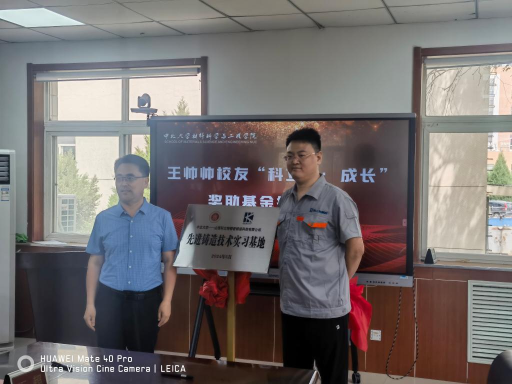 捐助仪式上,廖海洪书记代表学院对王帅帅董事长83周年校庆之际回馈母校表示感谢;王帅帅董事长回顾了在校期间的生活与学习,感谢在校期间材料学院教师对自己的培养。随后薛实军理事长与王帅帅董事长共同签订了捐助协议;刘国东秘书长代表校友基金接受了捐赠;王强院长为王董事长颁发捐赠证书;尹建平副校长与王帅帅董事长共同为“中北大学—山西科立特精密铸造有限公司先进铸造技术实习基地”揭牌;闫玉喜会长介绍了晋城校友会的工作;杨波会长指出要加强校友企业与学校的联系,建立校友与学校的紧密合作关系。