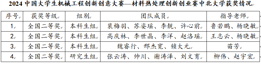 2024年7月13日,在中国机械工程学会主办,中国机械工程学会热处理分会和上海工程技术大学承办的“2024中国大学生机械工程创新创意大赛——材料热处理创新创业赛”中,中北大学学子再创佳绩:荣获全国二等奖四项、大区赛金、银奖各四项。本次大赛我校在本科生组获奖数量位于山西省前列。