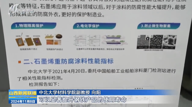在军民工程和装备领域,对高性能防腐涂料的需求正日益增长。中北大学功能高分子复合材料山西省重点实验室,成功开发出具有自主知识产权的新型石墨烯改性重防腐涂料。这一创新产品的耐盐雾寿命超过6000小时,是当前国际市场上最优重防腐涂料耐盐雾寿命的两倍。这一突破性成果受到了山西新闻联播的关注,并特别采访了乐鱼官网副教授向阳。
