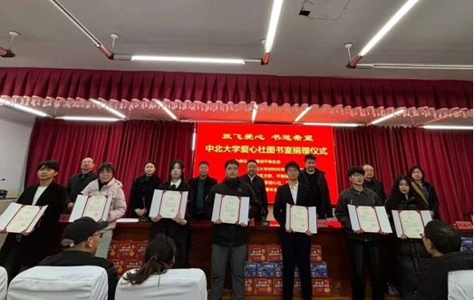 之后,主席台各位领导向中北大学爱心社学生代表颁发聘书,同学们被聘为平鲁区“爱心宣传大使”;平鲁区实验小学校长赵春叶授予中北大学爱心社社长庞学涛同学锦旗;材料学院团委书记郝诗韵与平鲁区团委书记卢丽花共同为“爱心书屋”揭牌。