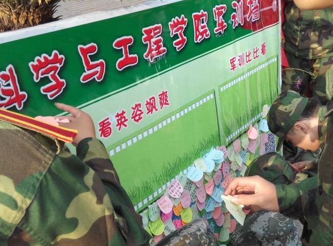 一天的军事训练结束前,同学们在老师的倡议下,在小纸条上写下军训寄语,并将其贴在我院军训墙上,实时记录了同学们的心境及感受。军训墙上承载着新生们各种话语的小纸条不失为一道亮丽的风景线。