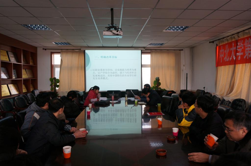 首先由冯院长带领大家学习了《教育部关于做好全日制硕士专业学位研究生培养工作的若干意见》、《教育部 国家发展改革委 财政部关于深化研究生教育改革的意见》、《教育部 人力资源社会保障部关于深入推进专业学位研究生培养模式改革的意见》、《中北大学关于进一步深化研究生教育改革的实施方案》、《中北大学关于全日制专业学位研究生培养工作的基本规定》、《中北大学全日制硕士专业学位研究生专业实践基本规定》等相关文件。