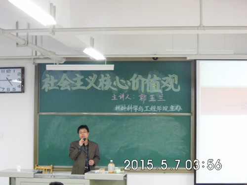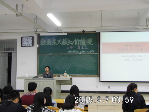 为了加强我院学生党员对社会主义核心价值观的深入理解,2015年5月7日下午在15202H教室,我院特邀中共山西省委党校、山西行政学院省情与发展研究所副所长郭玉兰教授为全院学生党员召开了题为“感悟与践行——谈谈社会主义核心价值观”的学习报告会。