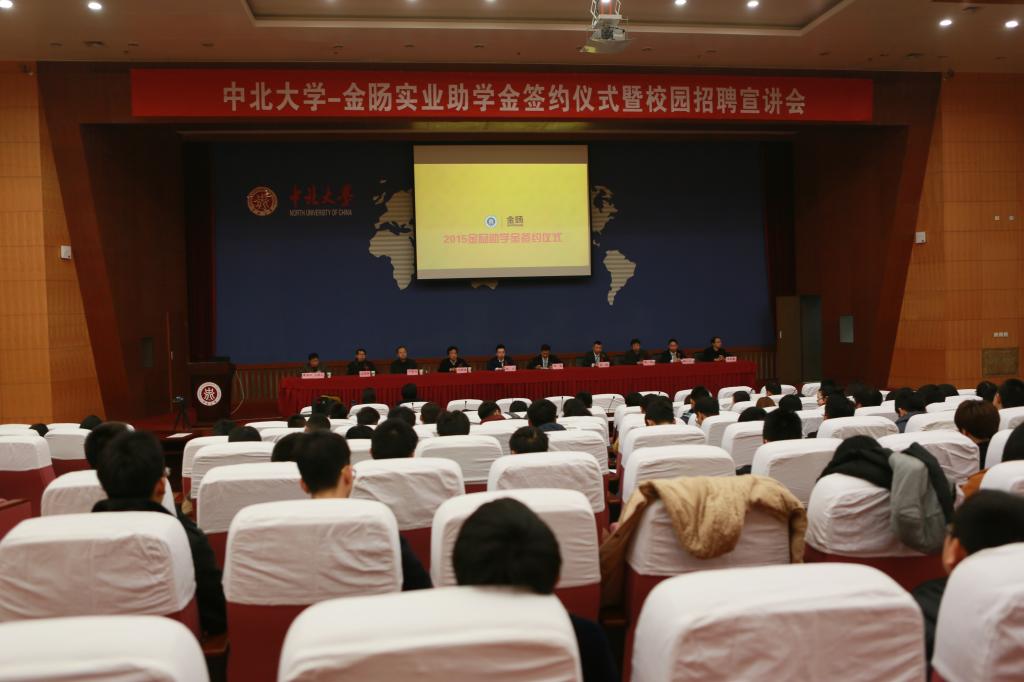 12月9日,“中北大学—金旸助学金”签约仪式暨校园招聘宣讲会在图书馆学术报告厅举行。副校长韩焱,金旸(厦门)实业有限公司董事、大阳慈善会理事杨杰出席签约仪式。招生就业处处长雷锋斌、学生工作处处长邱建国、leyu.com党委书记侯华、副院长冯再新、副院长李迎春参加了仪式。签约仪式由leyu.com党委副书记廖海洪主持。