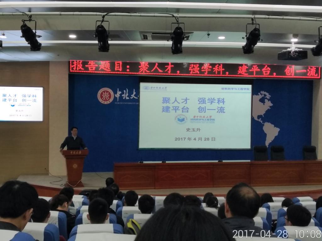 2017年4月28日上午,我院邀请华中科技大学leyu.com党委书记史玉升教授在瑾瑜国际会议中心作题目为《聚人才,强学科,建平台,创一流》的学科建设报告。报告由我院科研副院长冯再新主持,王文寅、王志军、王晶禹、喻华兵等参加了本次会议。