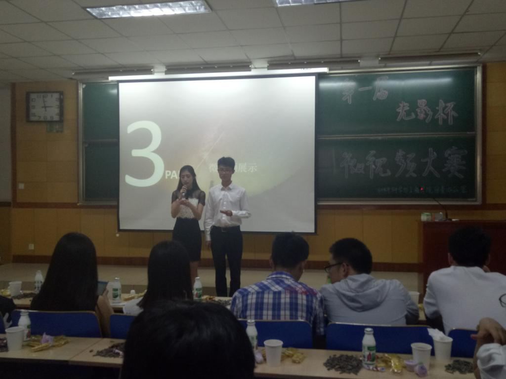 5月20日下午,leyu.com团委办公室在09102教室举办了第一届光影杯,及"中国梦,青春梦"为主题的微视频大赛。本次比赛有幸邀请到我院学生科郝小军老师,校学生会办公室主任李学坤,机电工程学院学生会办公室主任马佳伟,机电工程学院团委办公室主任郭光光等各院办公室主任以及我院学生会主席孙大堡,公寓科主任史林坤,文体副主席樊洪智,分科协主席苏立等各部门部长出席。
