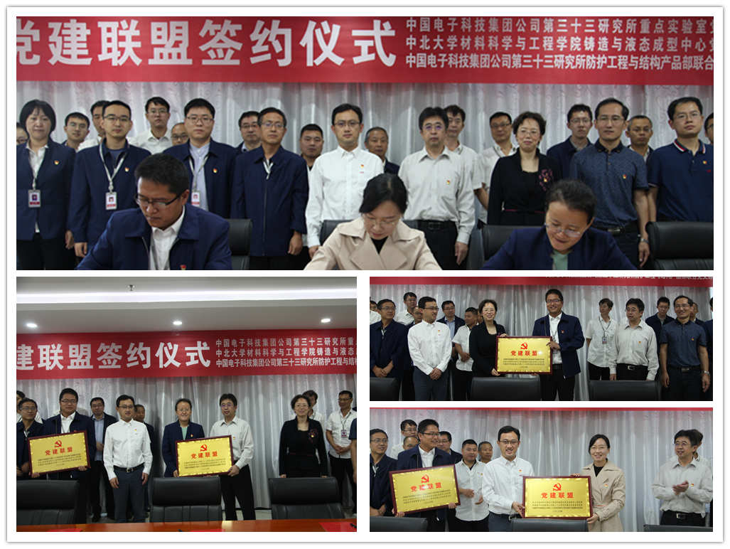 9月24日,乐鱼官网铸造与液态成型中心党支部、中国电子科技集团公司第三十三研究所电磁防护材料及技术山西省重点实验室党支部、防护工程与结构产品联合党支部在三十三所举行党建联盟签约仪式。乐鱼官网院长侯华、党委副书记郭云霞、副院长刘斌、三十三所副所长易克非、党群工作处处长王立武亲临签约现场,共同见证了签约仪式。仪式由三十三所党群工作处处长王立武主持。