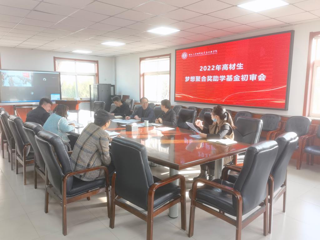 与会人员就申报奖助学金的学生材料进行审核,就体测问题、勤工助学上岗要求、名额分配以及助学金初审中遇到的新问题等进行了进一步的研究讨论。其次,评审小组商定按比例1:1.5,确定进入答辩的学生名单,其中助学金评审主要考虑学生家庭经济情况及班级评议情况为主要依据,最终29名同学进入奖学金答辩环节、9名同学进入助学金答辩环节。第三,会上讨论决定,本次评审后,将进一步根据本次遇到的问题,重新对《高材生梦想聚合奖助学基金评定办法》进行修订。