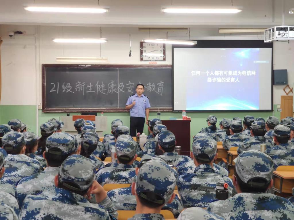 01202H等5个教室成功举办21级新生电信诈骗和传染病预防健康教育讲座,学生科科长殷炳叶、军训教官及2021级574名全体新学生参加了本次教育讲座。