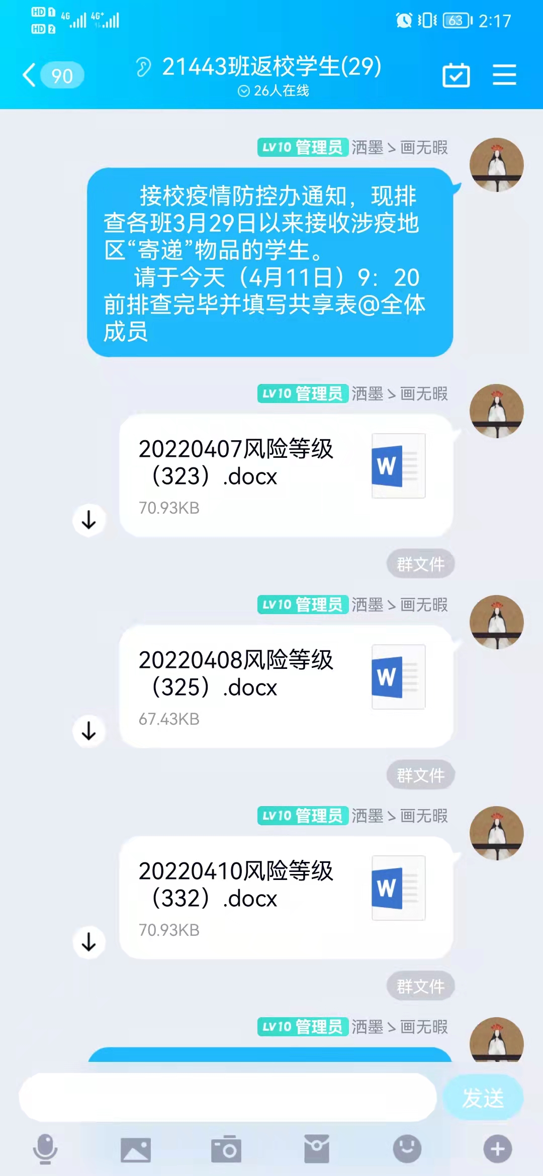 面对每天的抽检、全员核酸检测,刘老师以宿舍和办公室做“战场”,从编辑通知、组织志愿者、维持秩序、检测扫描,她都在不断优化现场每个细节,坚守每一个环节全力以赴保障学生快速、安全接受检测。在两轮核酸检测+一轮抗原检测过程中,刘老师时刻陪伴在学生身边。从封闭之日起,刘老师便进驻学生公寓全天候守护着,叮嘱学生拿好出行证,戴好口罩,做好疫情防护,有序出行不乱跑。