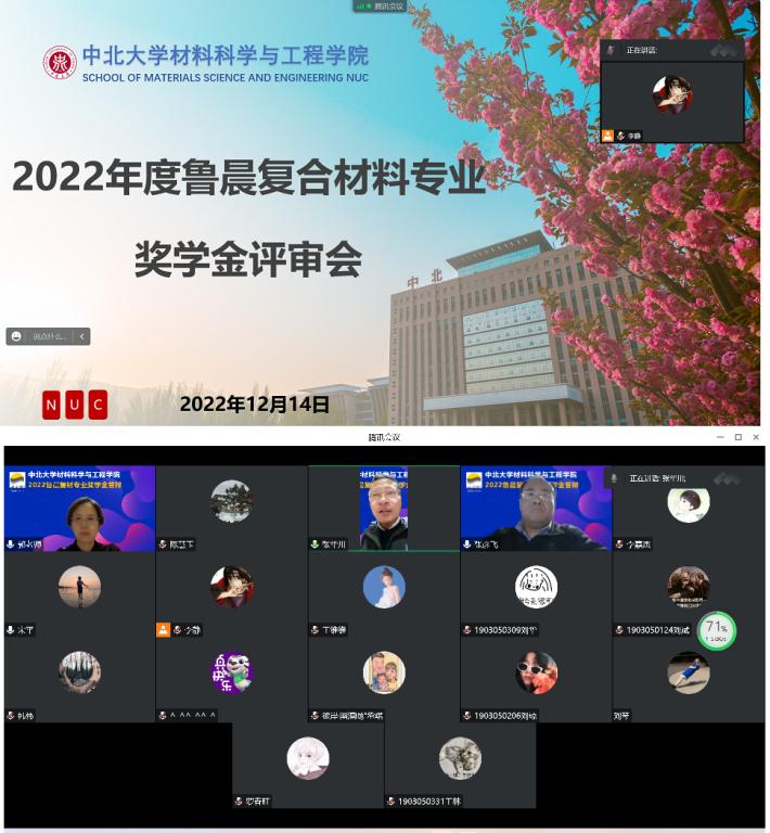 根据《鲁晨复合材料专业奖学金评选管理办法》文件精神,学院于2022年12月14日19时在腾讯会议进行了2022年度鲁晨复合材料专业奖学金评审会。参加本次评审工作的评委有:leyu.com院党委副书记郭云霞,成都鲁晨新材料科技有限公司技术总监张华川,复合材料与工程专业老师张彦飞、陈慧玉、宋平,学院辅导员老师贾越、韩伟、张维叶、褚嫱、刘琴、李静。
