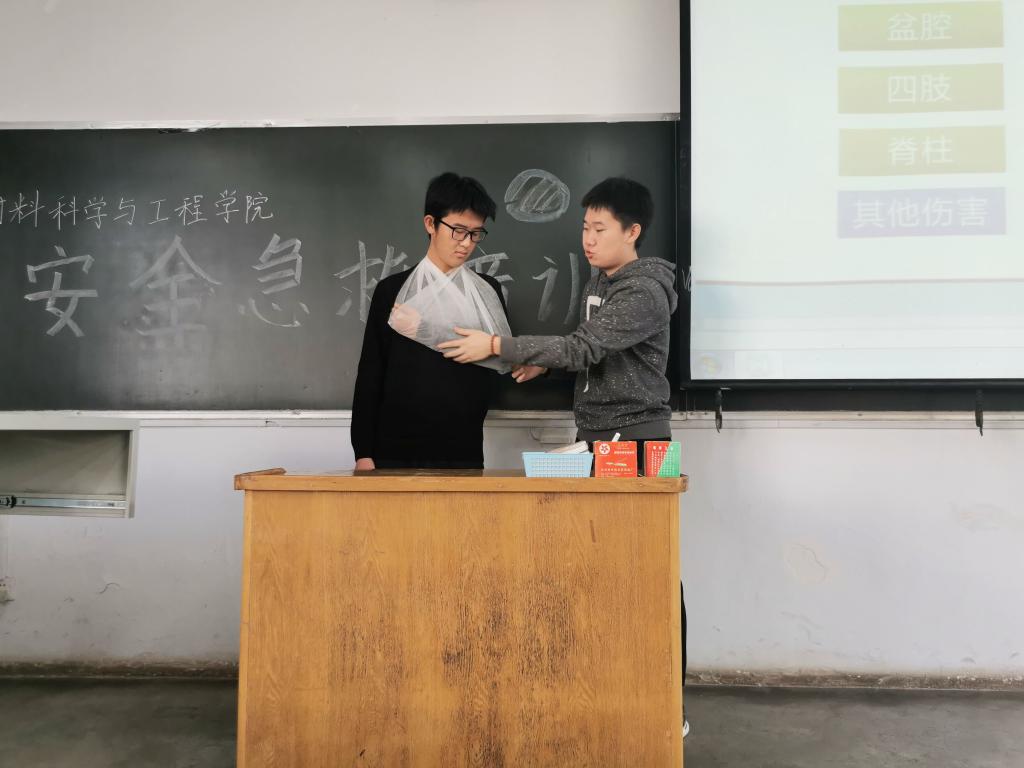 张天誉同学先是给同学们介绍了常见的意外受伤类型及相应的处理方法,然后为同学们强调了当遇到他人发生意外时应该注意的地方。他提到了四点:第一,我们要确保自身安全,只有在自身安全的情况下才能更好地帮助他人;第二,我们要确保同伴安全;第三,我们要确保被救人员安全;第四,我们要先救命,后治病。在紧急情况下想要细致地进行救援是不现实的,我们只有在保证被救人员生命安全的情况下才有更多的精力去思考其他。张天誉同学还请了两位同学做演示,向大家展示了紧急包扎的技巧。整个培训过程生动有趣,毫不枯燥。大家在阵阵掌声中学到了很多急救知识与技能。