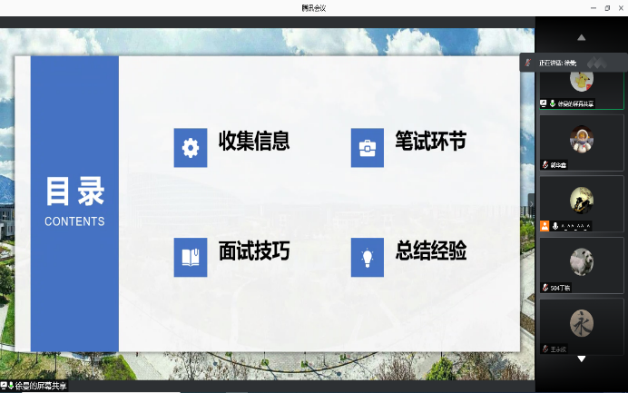 在本次经验交流会上,首先由西北工业大学的王永欣教授分别从复试的形式、笔试、综合面试、政审、心理测试、体检、防疫等几个方面向同学们说明了注意事项和相关技巧,带来了宝贵的第一手资讯,为同学们提供了准备的方向。然后又分别从调剂的准备和考研二战两方面启发同学们思考对于人生的规划,并在交流最后解答了大家们的疑惑与问题,使同学们受益匪浅。