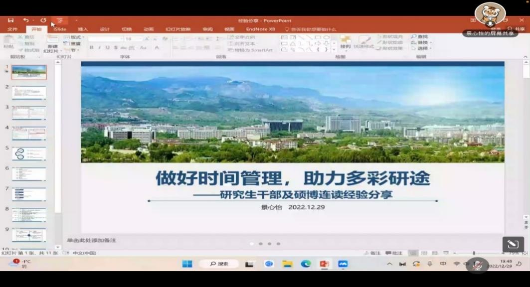 景心怡主要分享了硕博连读以及时间管理的经验,旨在告诫同学们一定要重视过程与结果,早做规划,并对身兼数职的研究生干部提出建议,表达摆好心态的重要性。