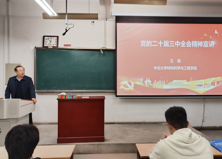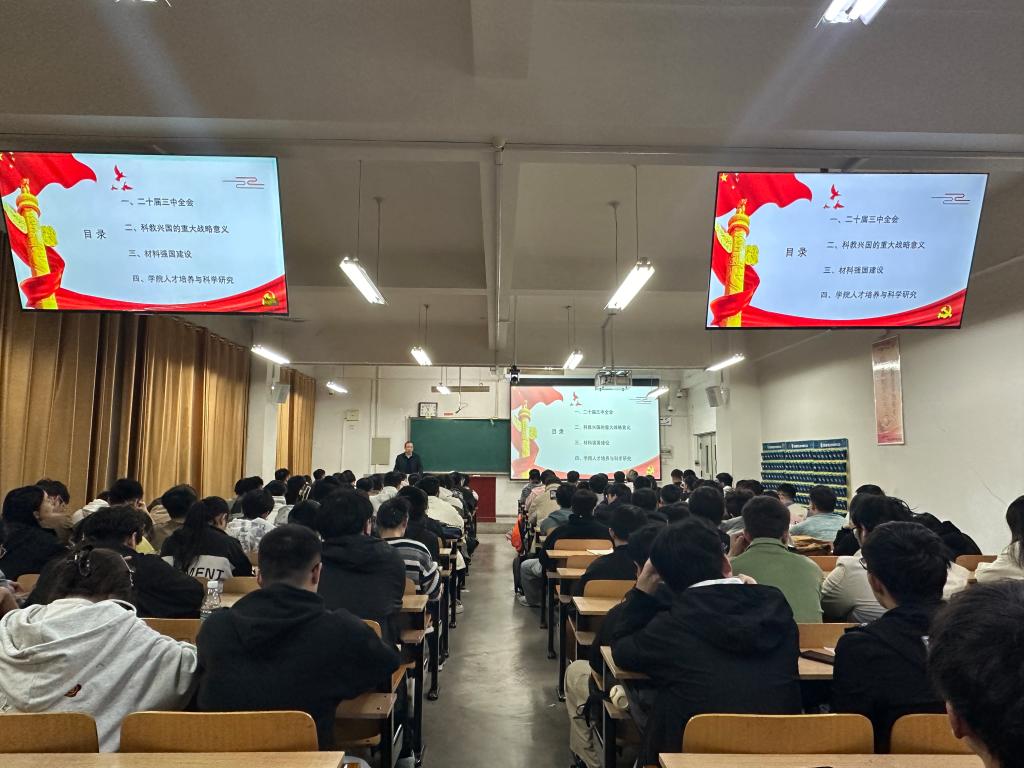 王强院长围绕党的二十届三中全会精神、科教兴国的战略意义、材料强国建设、材料学院人才培养与科学研究这四个方面进行了全面宣讲和系统阐述。